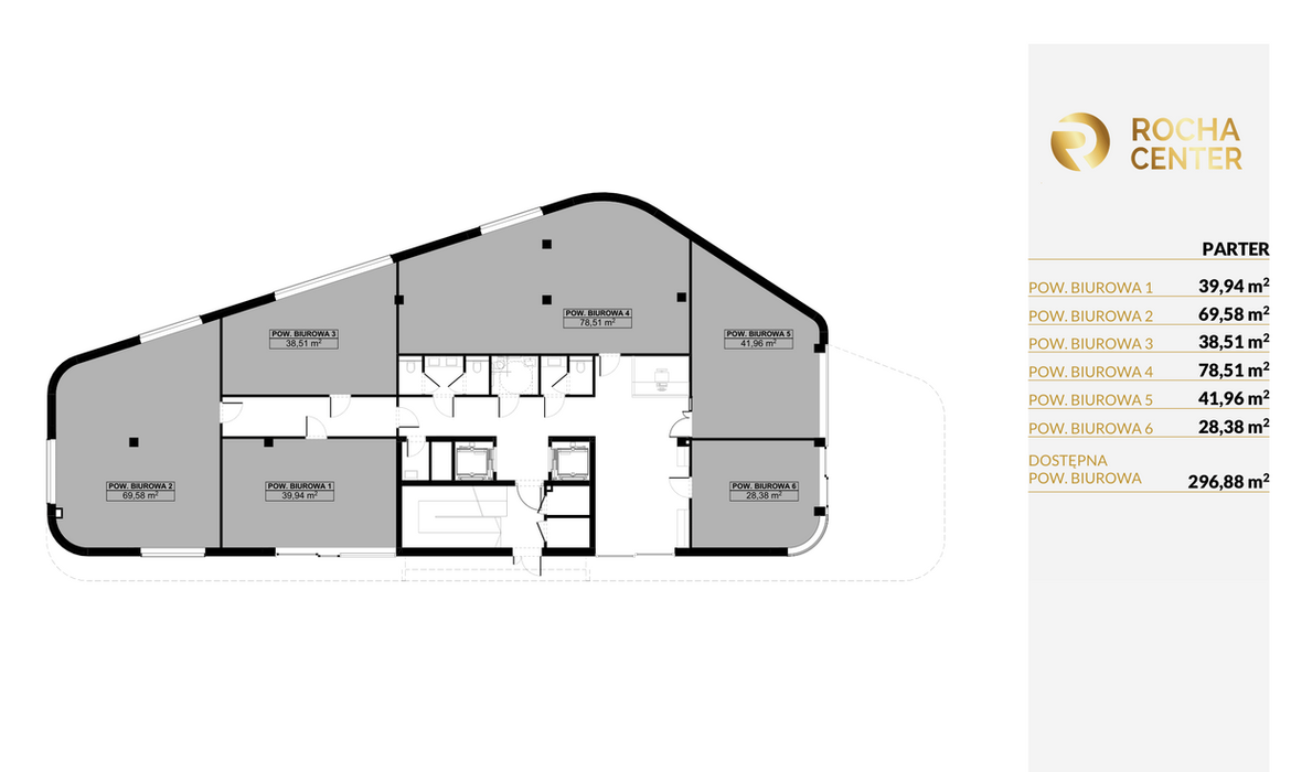 Parter podzielono na hol wejsciowy i lokale ustugowe lub handlowe, natomiast wyzsze kondygnace jako otwarte i uniwersalne przestrzenie zapewniajace uzytkownikowym wvskoki standard pracy.